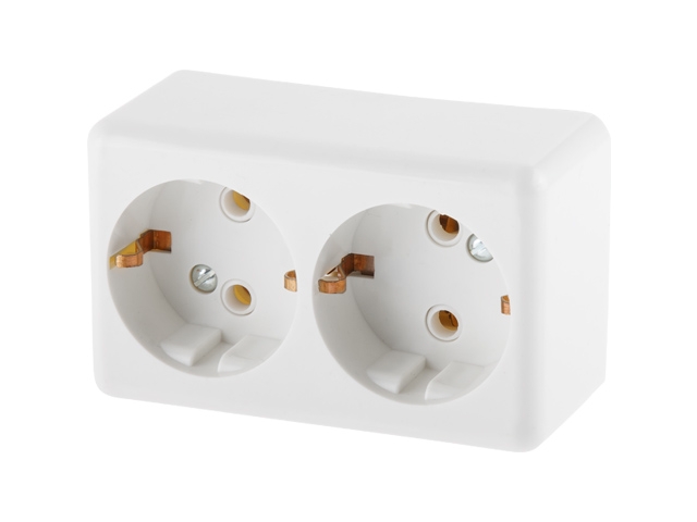 Розетка двухместная открытой установки с заземляющим контактом, с монтажной панелью предназначена для присоединения электрических приемников с номинальным напряжением 250 В к электрической сети переменного тока в нормальных климатических условиях внешней среды по ГОСТ 15150 и ГОСТ 15543.1.