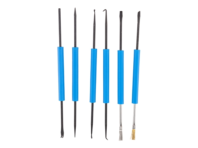 Набор для пайки (6 предметов) REXANT предназначен для монтажных и ремонтных работ с радиоэлементами на платах, в корпусах аппаратуры, в часовых механизмах и т. п. Используется в электронике, моделировании и ювелирном деле. Ручки из качественной пластмассы не растворяются в отмывочных жидкостях.