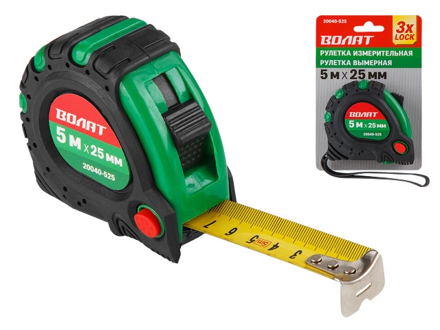 Рулетка 5м/25мм обрезин. корп. ВОЛАТ (быт.) (3 независимых механизма фиксации ленты)Характеристики: