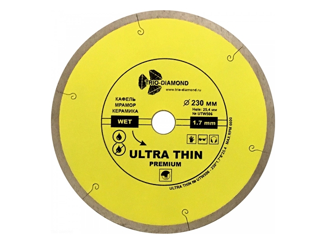 Алмазный круг 230х25,4мм по керамике сплошн.ультратонкий Hot Press (1.7мм) (TRIO-DIAMOND)Характеристики: