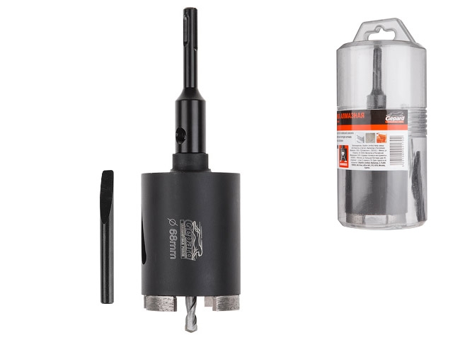 Комплект: коронка с алмазными сегментами, направляющее центрирующее сверло по бетону, держатель для коронки с хвостовиком SDS-plus, клин для выбивания центрирующего сверла из державки;