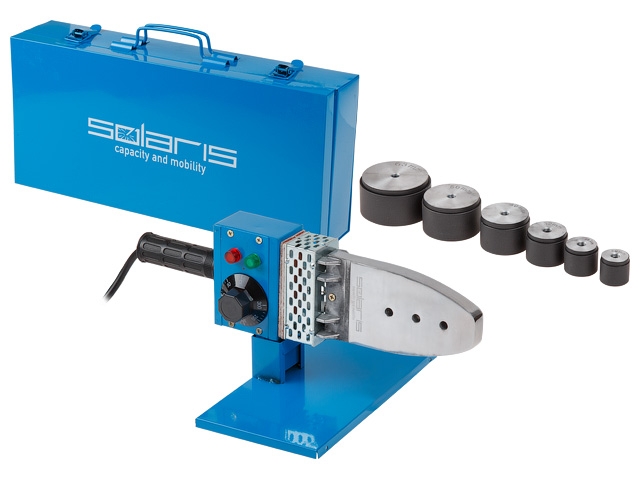 Сварочный аппарат мощностью 1000 Вт с регулировкой температуры и оснащенный 6ю насадками от 20 до 63 мм - оптимальный выбор для проведения разнообразных сантехнических работ.