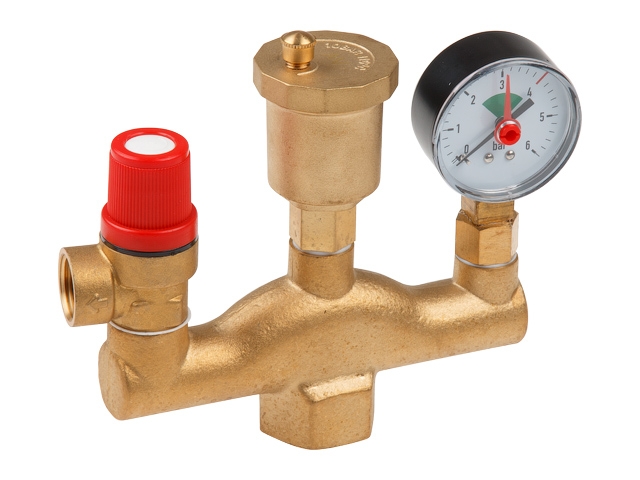 Комплектная группа безопасности для оснащения котлов. Применяется в установках с тепловой мощностью до 44 кВт (определяется штатным предохранительным клапаном), номинальным давлением не выше 10 бар, рабочей температурой не более 120 °С. Допустимая рабочая среда - пар, вода, незамерзающий теплоноситель (максимальное содержание гликолей - 50 %). Состав изделия: предохранительный клапан (настройка - фиксированная, 3 бара), автоматический воздухоотводчик, манометр, латунный никелированный корпус. Группа безопасности котла монтируется на выходе теплогенератора. Резьба присоединения - внутренняя, 1".