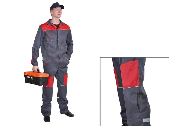 Отделочная ткань красного цвета: кокетки поло чек куртки, детали шлицы рукава, мешковины боковых карманов полукомбинезона с цельнокроеным бочком, накладные карманы передних половинок полукомбинезона, паты клапанов карманов.