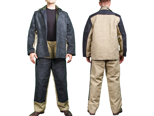 Костюм на 45% производится из спилка кож крупнорогатого скота методом аппликации (нашивки) на основу из полульняной парусины (54% - лён, 46% - хлопок) с огнестойкой пропиткой.
