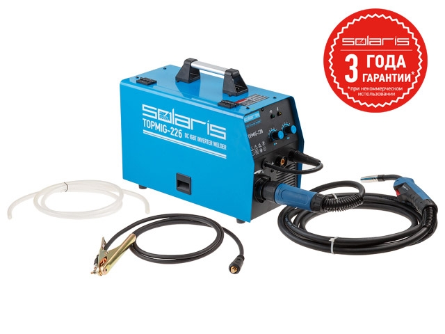 Инверторный сварочный аппарат, позволяющий варить в режиме полуавтоматической MIG/MAG/FLUX сварки. Аппарат оснащен евроразъемом для горелки, возможностью смены полярности для сварки проволокой без газа (FLUX). На выбор представлены 2 комплектации: с горелкой 3 метра (арт.TOPMIG-226WG3) и с горелкой 5 метров (арт.TOPMIG-226WG5).